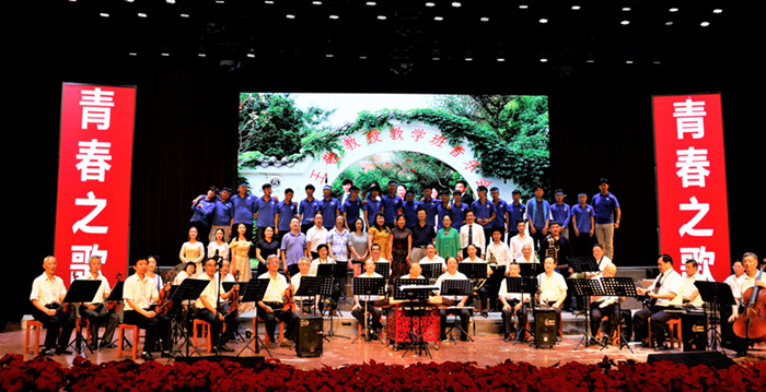本次音乐会由我院副院长王敬担任指导老师。西南师范大学毕业,退休的原金堂高中校长袁国平担任指挥。我院学生寇杭、蒋绅、宋桓宇、贾璋岷、次仁娜姆参与演唱。金堂淮口中学高一段沈馨及自贡曙光中学高三何宇航担任助阵嘉宾。演艺学院的老师、成都五月花高级技工学校的汪校长、三星镇贾镇长、国家一级作曲指挥张坚、成都军区战旗歌舞团,以及演唱者、演奏者们合影留念。